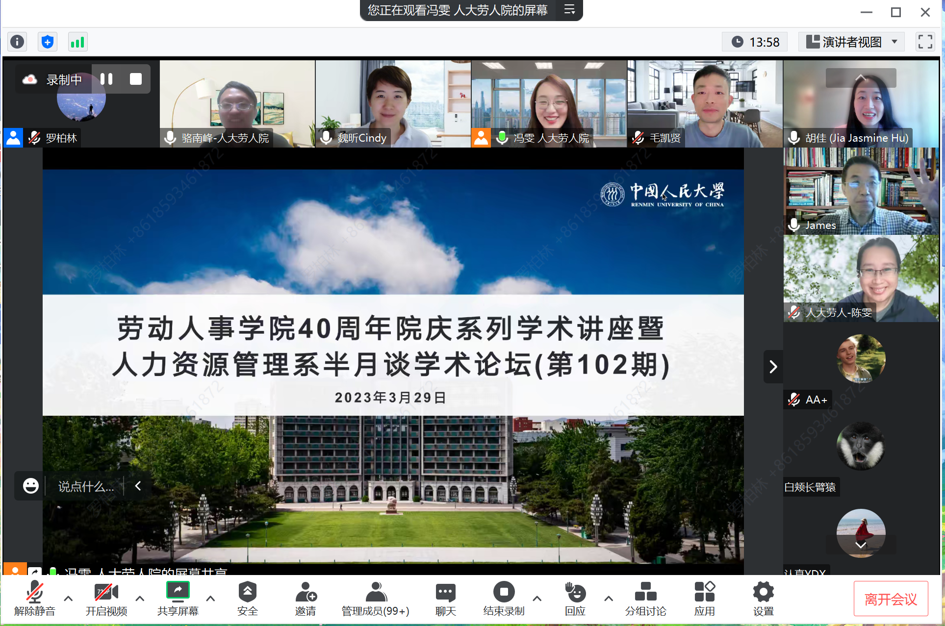 硬硬av 40周年院庆系列学术讲座暨人力资源管理系半月谈学术论坛(第102期)于2023年3月29日晚上21:00至23:00通过线上腾讯会议的形式成功举行。硬硬av 杰出校友、来自俄亥俄州立大学费舍尔商学院的胡佳教授进行了题为“从‘自我研究’(Me-search)到‘学术研究’(Re-search):从两篇最近发表的文章中得到的体会”的学术分享。本次学术论坛由硬硬av 人力资源管理系讲师冯雯主持,孙健敏教授、周文霞教授、文跃然教授、刘松博教授、魏昕教授、骆南峰副教授、王青副教授、陈雯助理教授、毛凯贤助理教授、校外专家学者以及三百余位博士生和硕士生参与了此次线上活动。