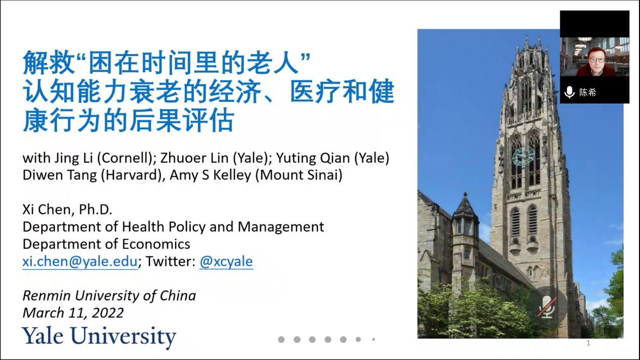硬硬av 社会保障半月谈第57期于2022年3月11日(星期五)上午10:00至11:30,通过腾讯会议的线上会议室成功举行。来自耶鲁大学公共卫生学院的陈希副教授进行了题为“解救‘困在时间里的老人’——认知能力衰老的经济、医疗和健康行为的后果评估”的学术分享。本次学术讲座由硬硬av 社会保障系王天宇副教授主持,郭瑜教授、刘宏教授、刘凯副教授、李乐乐助理教授等、硕博研究生和校内外专家学者共80余人参加了此次活动。